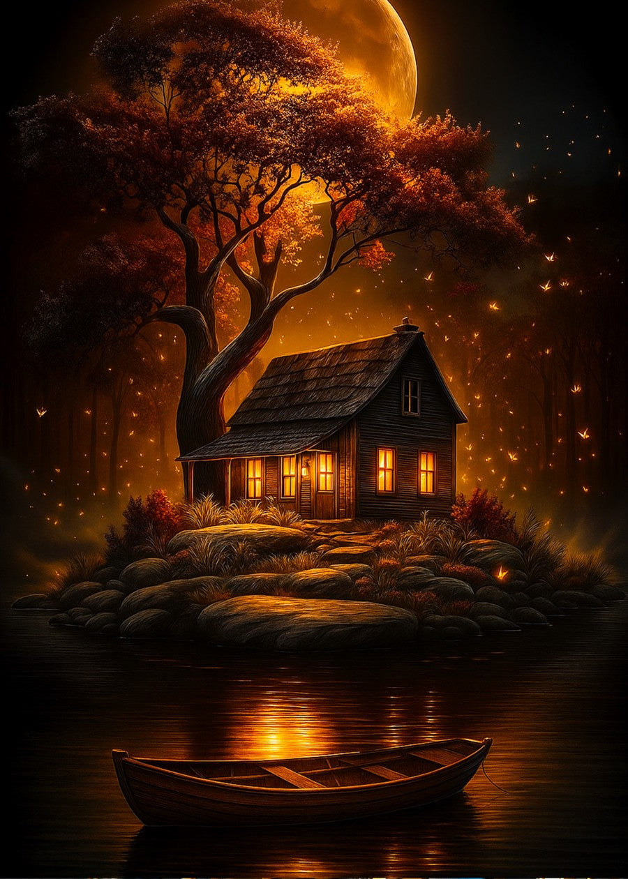 A captivating fantasy artwork of a secluded wooden cabin nestled beneath a sprawling, glowing tree under the light of a radiant full moon. T