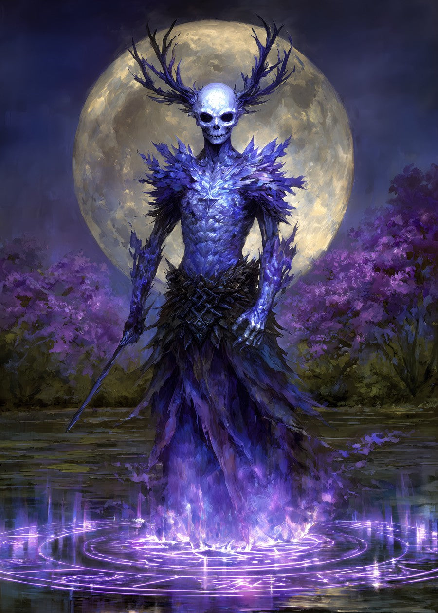 Ethereal figure rises amid violet mist, with an aura of mystical energy under a full moon.