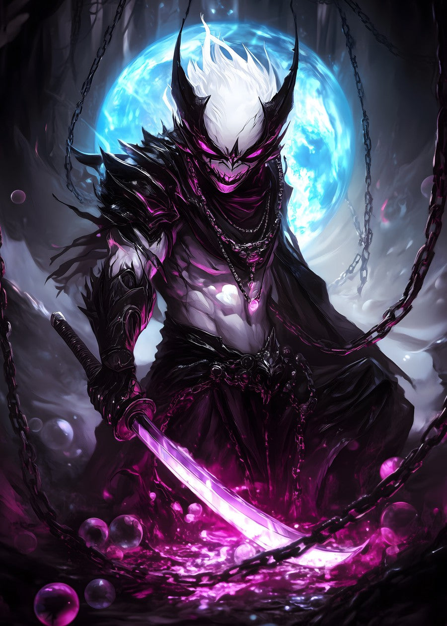 A mystical figure wields a glowing sword under the eerie moonlight.