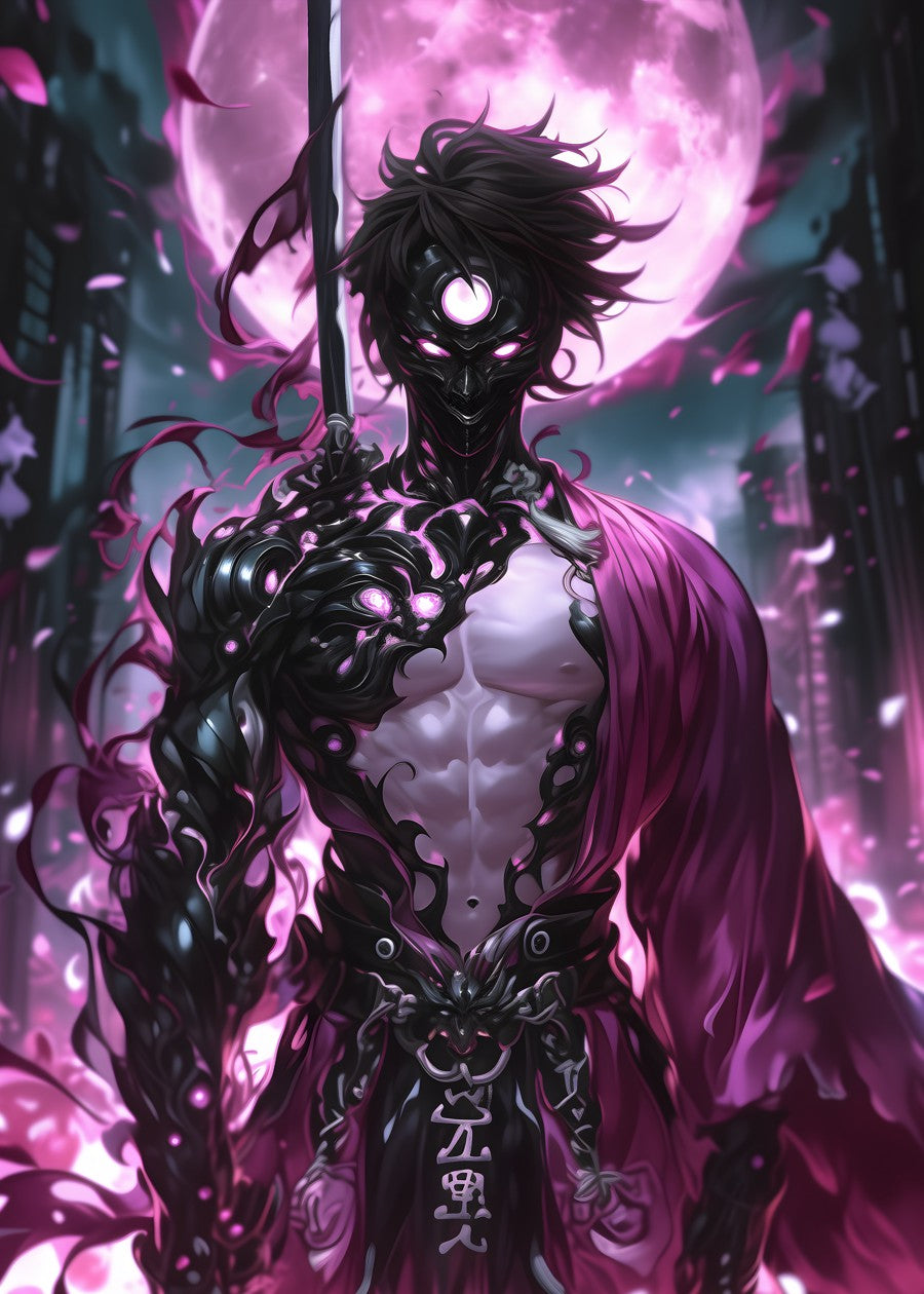 A mysterious warrior stands beneath a glowing full moon, radiating power and enigma.