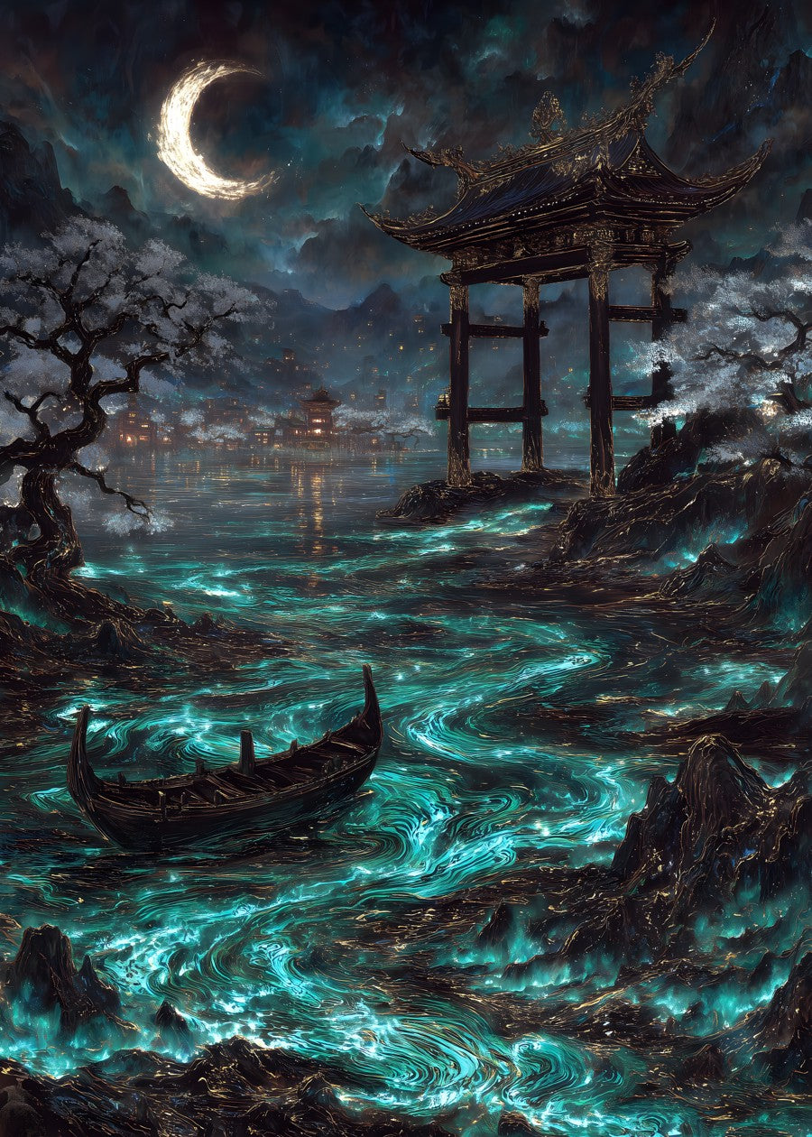 A luminescent river under a crescent moon flows beneath ancient gates, surrounded by ethereal cherry blossoms.