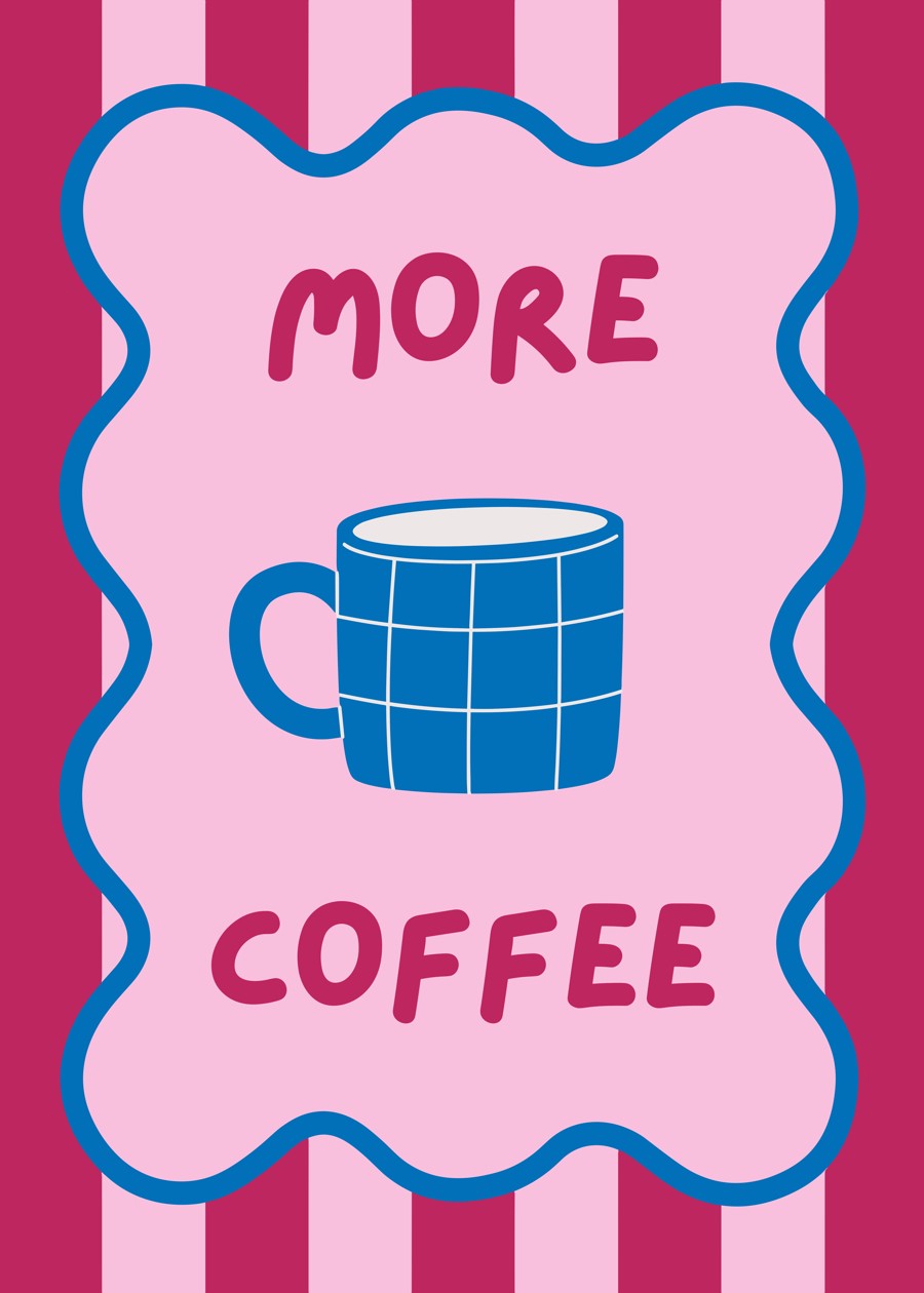 Playful, pastel art print with striped pink and red background, featuring a blue mug and the phrase “More Coffee” in cheerful rounded letter.
