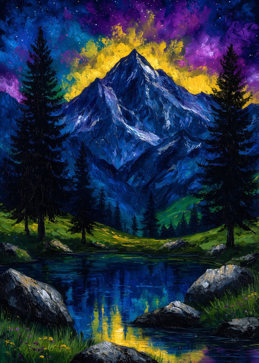 Vibrant colors illuminate the mountain and lake under a starry sky.