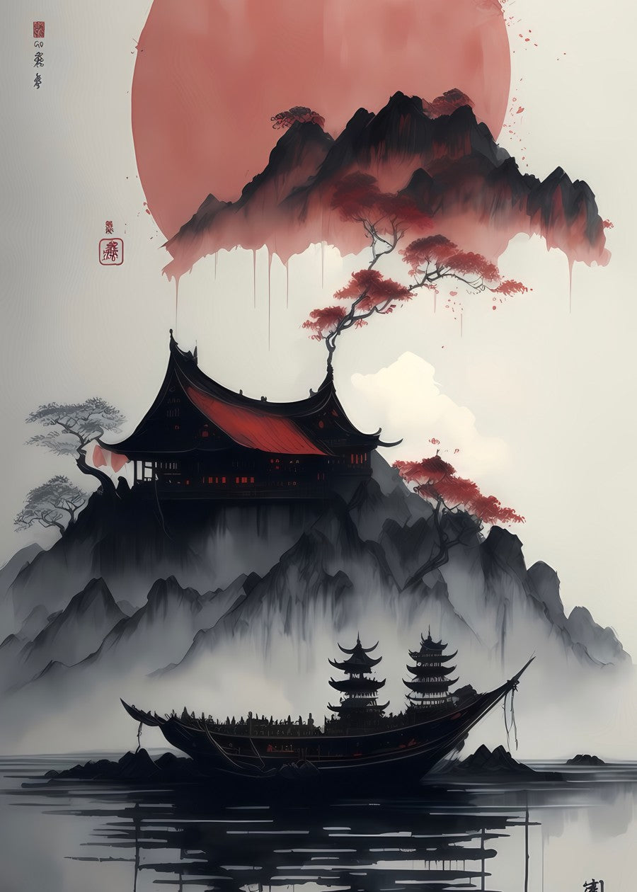 A surreal, stylized scene of a black temple and its boat on the water, overshadowed by a dramatic, blood-red moon and floating clouds.