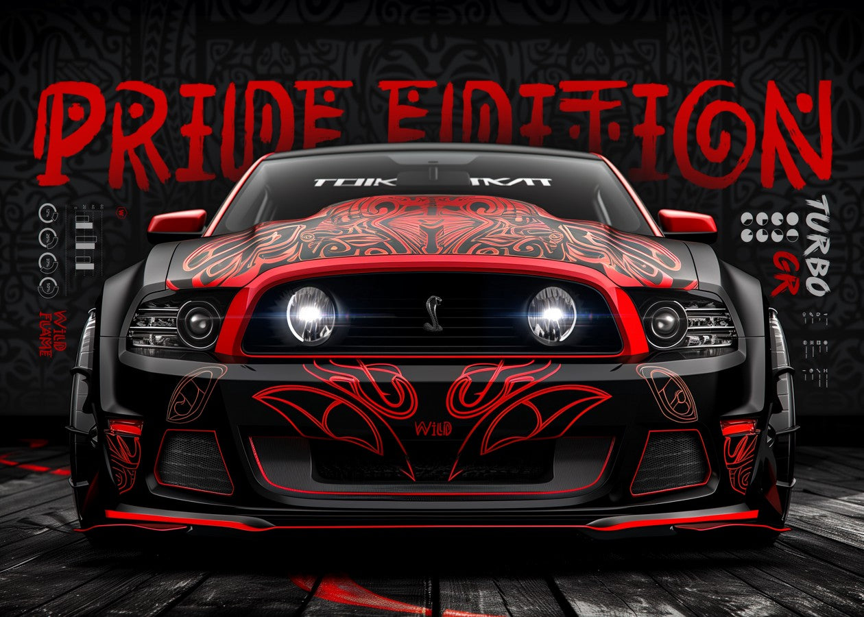 An overhead view of a custom black Ford Mustang adorned with intricate red tribal-like designs across its hood and front bumper.
