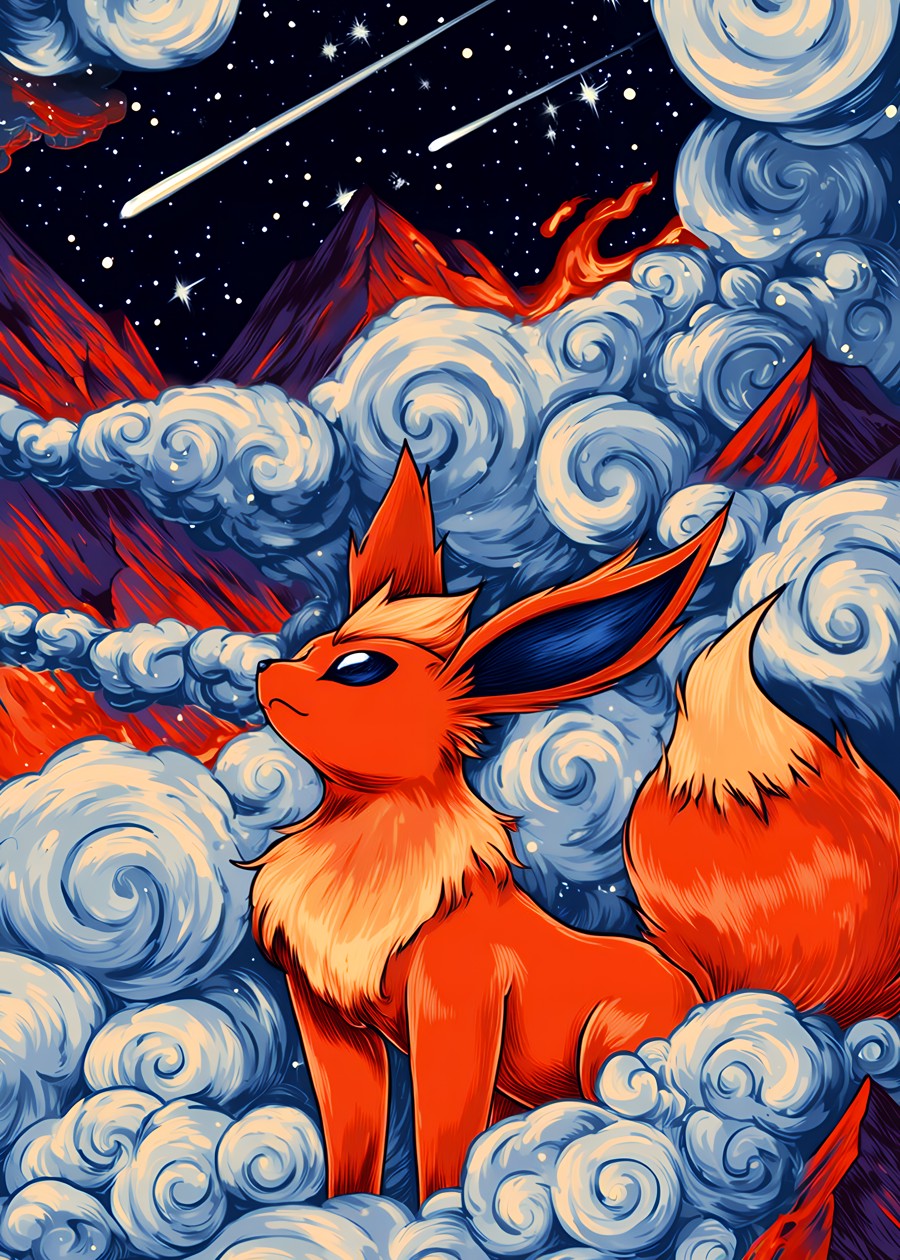 Flareon rests amid swirling blue clouds, red mountains, and a starry sky streaked with meteors, blending mystic and anime styles.