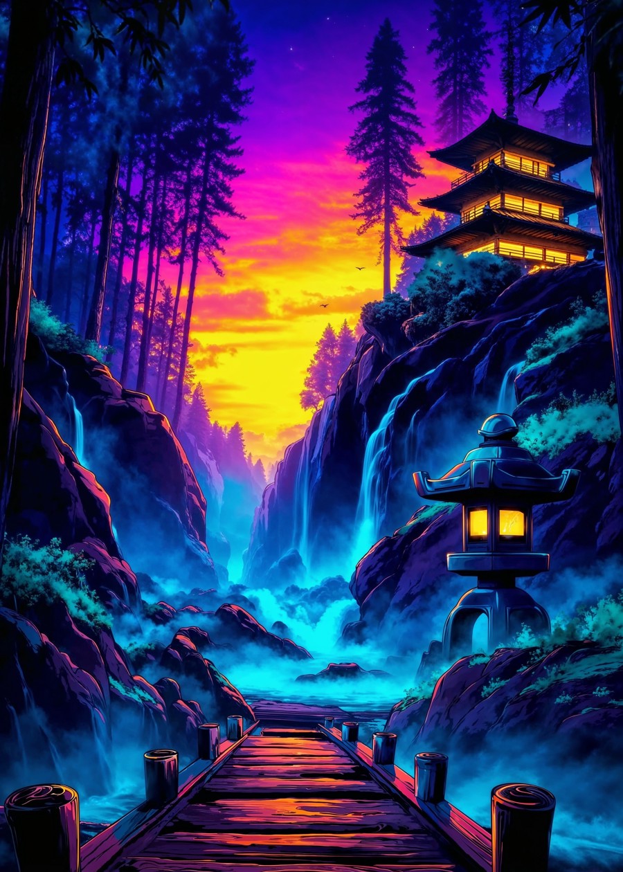 A glowing pagoda rises above a misty neon valley, where waterfalls and lanterns bathe in surreal blue and purple light.