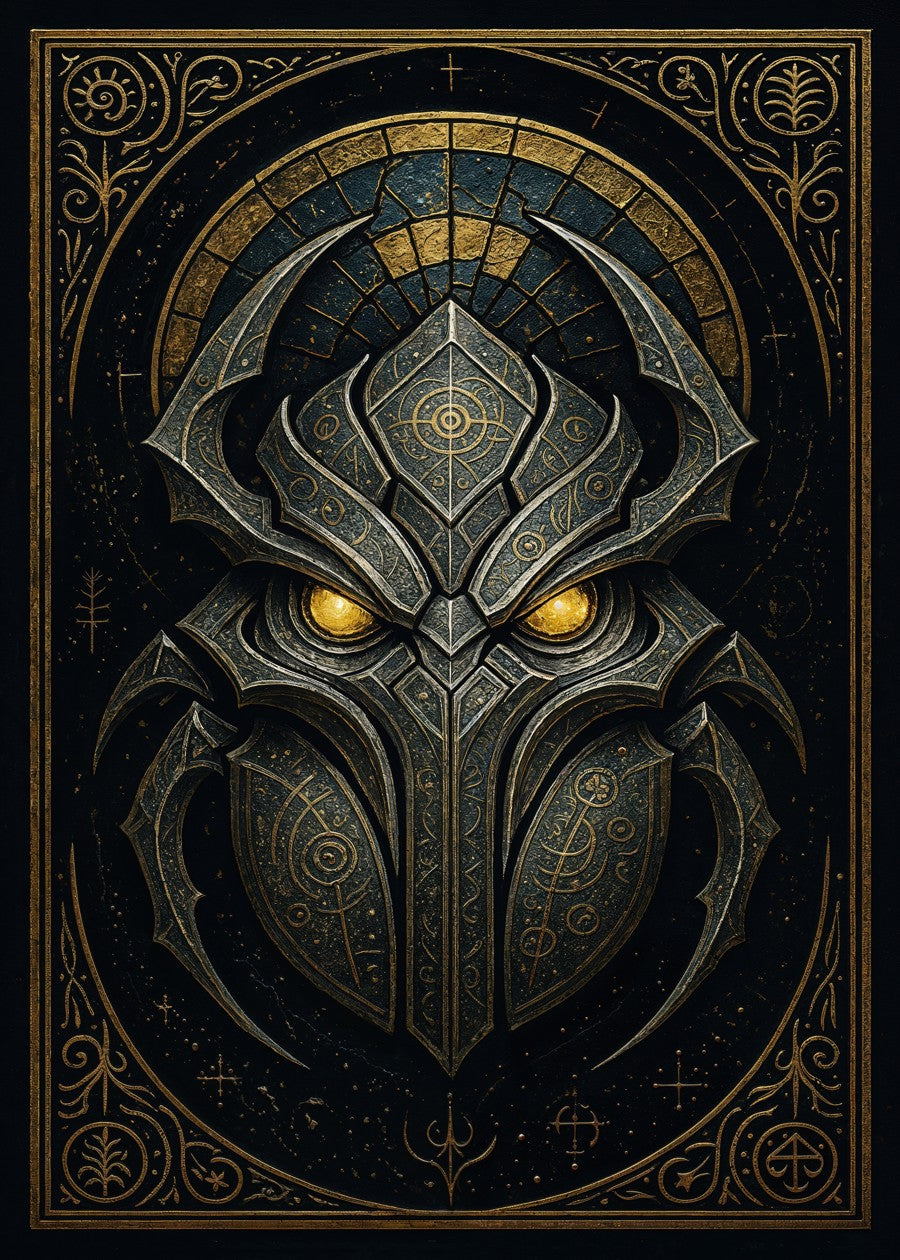 A cursed scarab forged in gold and armor, inscribed with runes and surrounded by gothic metal. This dark fantasy relic merges insect.