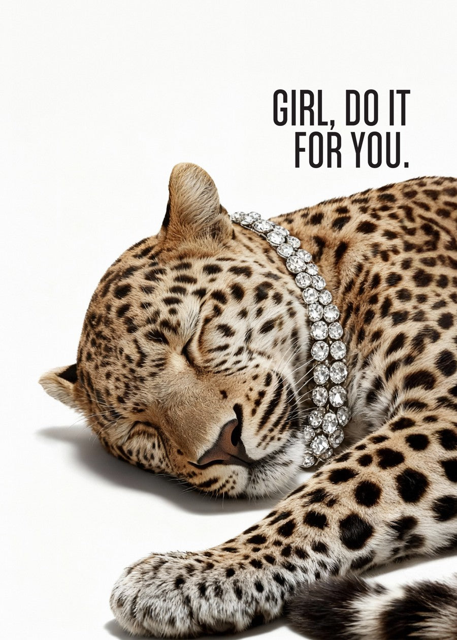A glamorous leopard, weighted down by a massive diamond necklace, taking a high-fashion power nap. "GIRL, DO IT FOR YOU."