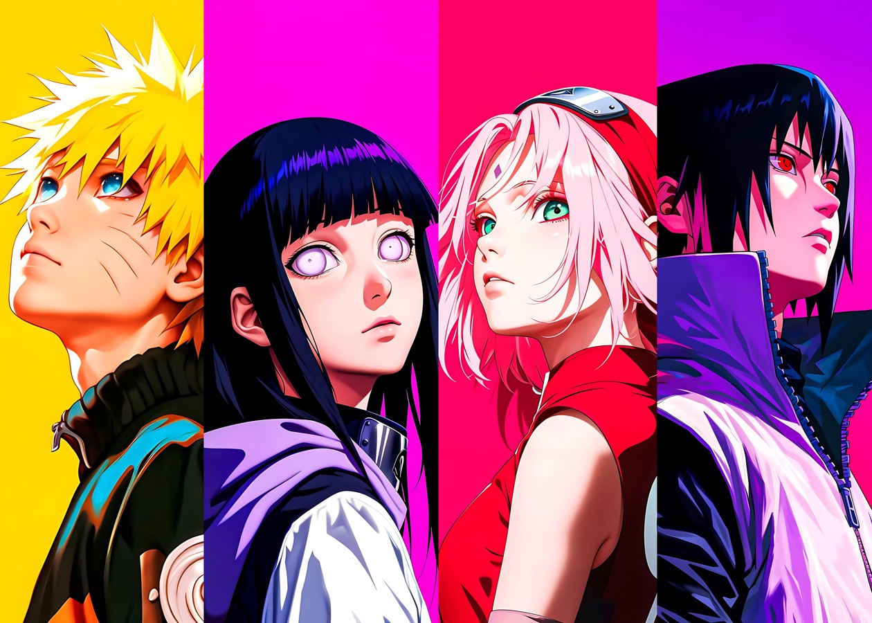 A collage of Naruto Uzumaki, Sasuke Uchiha, Hinata Hyuga, Sakura Haruno