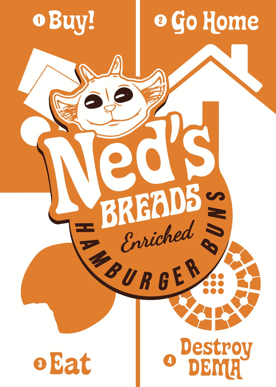 Promotional artwork for “Ned’s Breads” with a satirical twist, outlining four steps: Buy, Go Home, Eat, and Destroy DEMA.