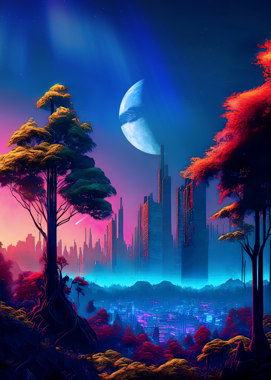 Neon cyberpunk city in a forest.