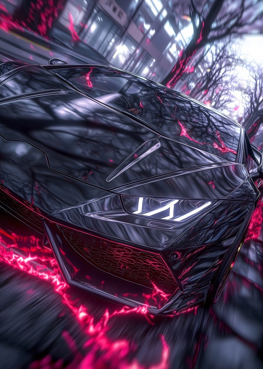 A sleek car races through a futuristic cityscape bathed in vibrant neon lights.