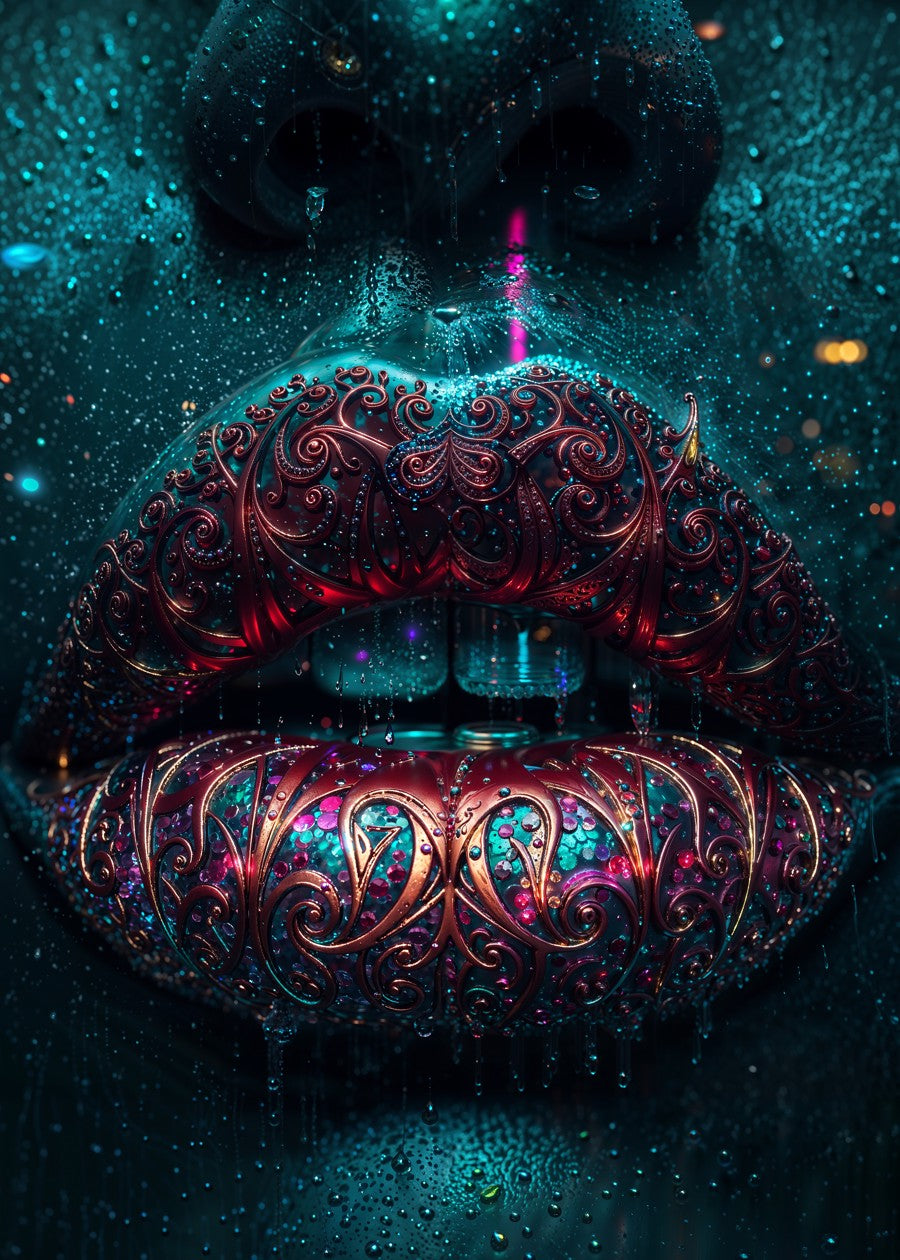 Close-up lips wrapped in ornate neon filigree; rain-specked skin and city lights shimmer across metallic patterns—striking cyberpunk glamour