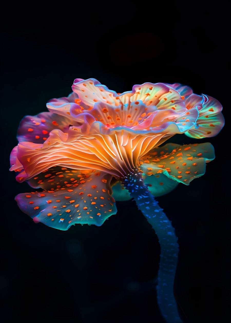 A surreal neon flower radiates with glowing hues of orange, blue, and violet—like nature’s dream under blacklight.