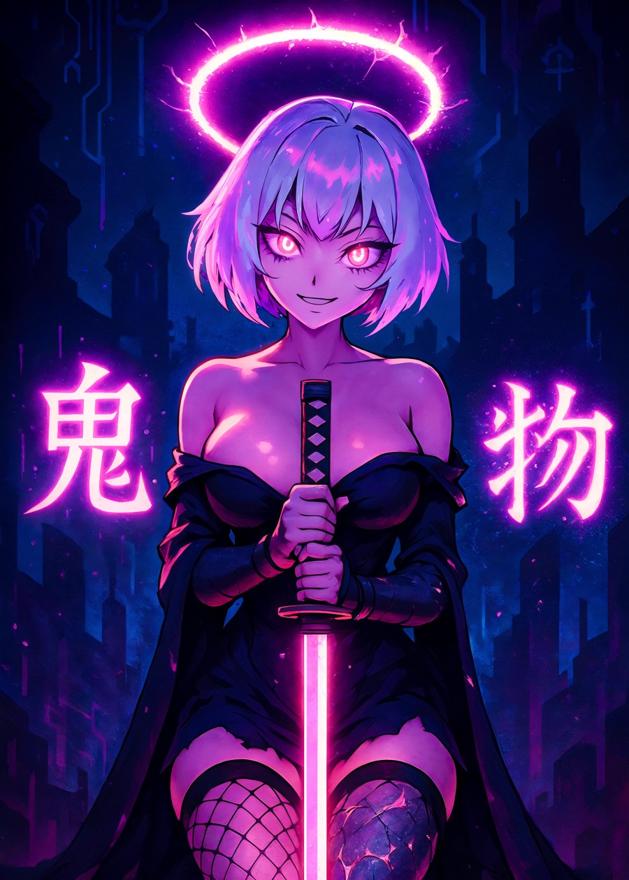 A glowing-eyed anime waifu stands between angel and demon – sexy, gothic, and armed with a katana. This cyberpunk fantasy girl.