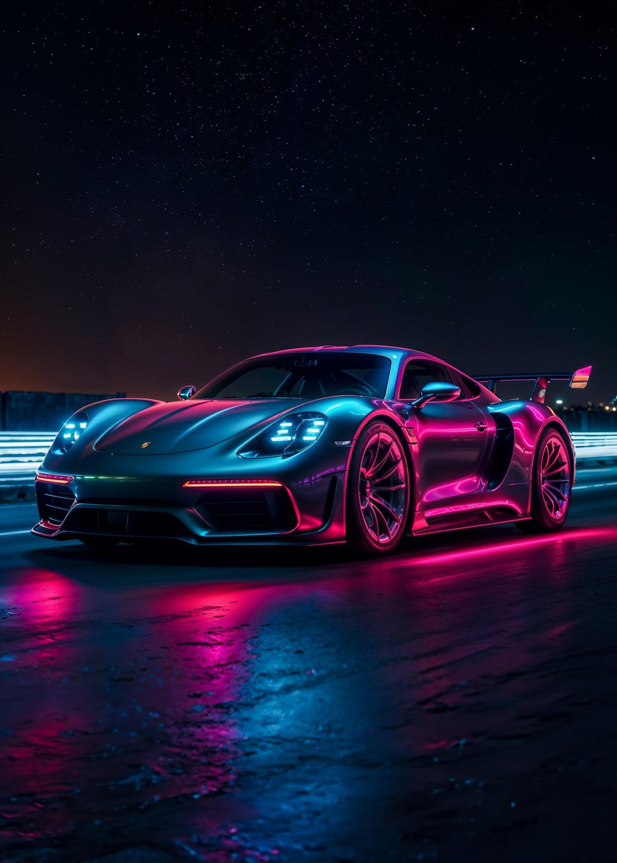 Porsche 911 in neon glow, a luxury racing car. Night speed and cyberpunk design capture automotive perfection.