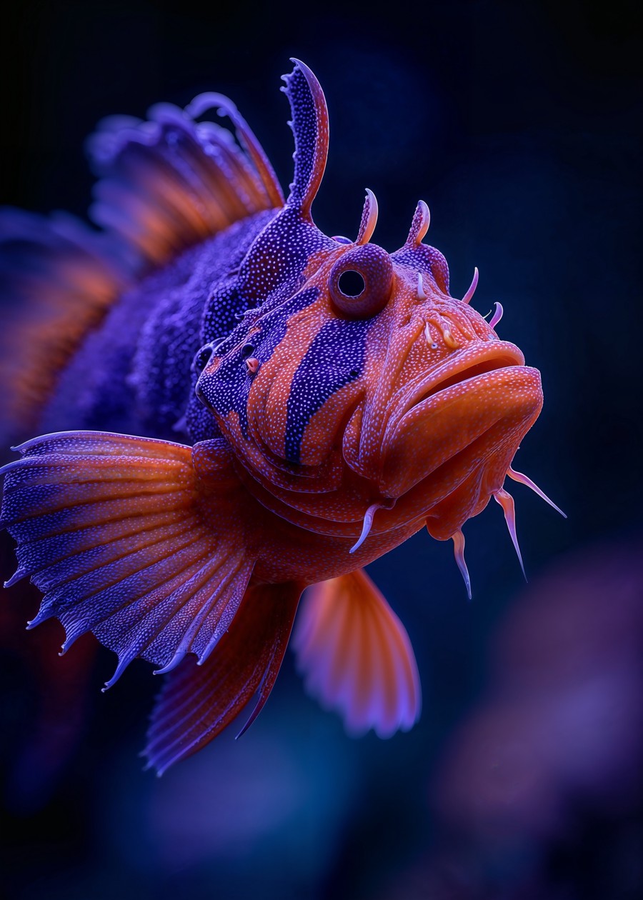 An exotic fish glows in brilliant shades of orange and violet — a radiant guardian from the electrified depths of the ocean.