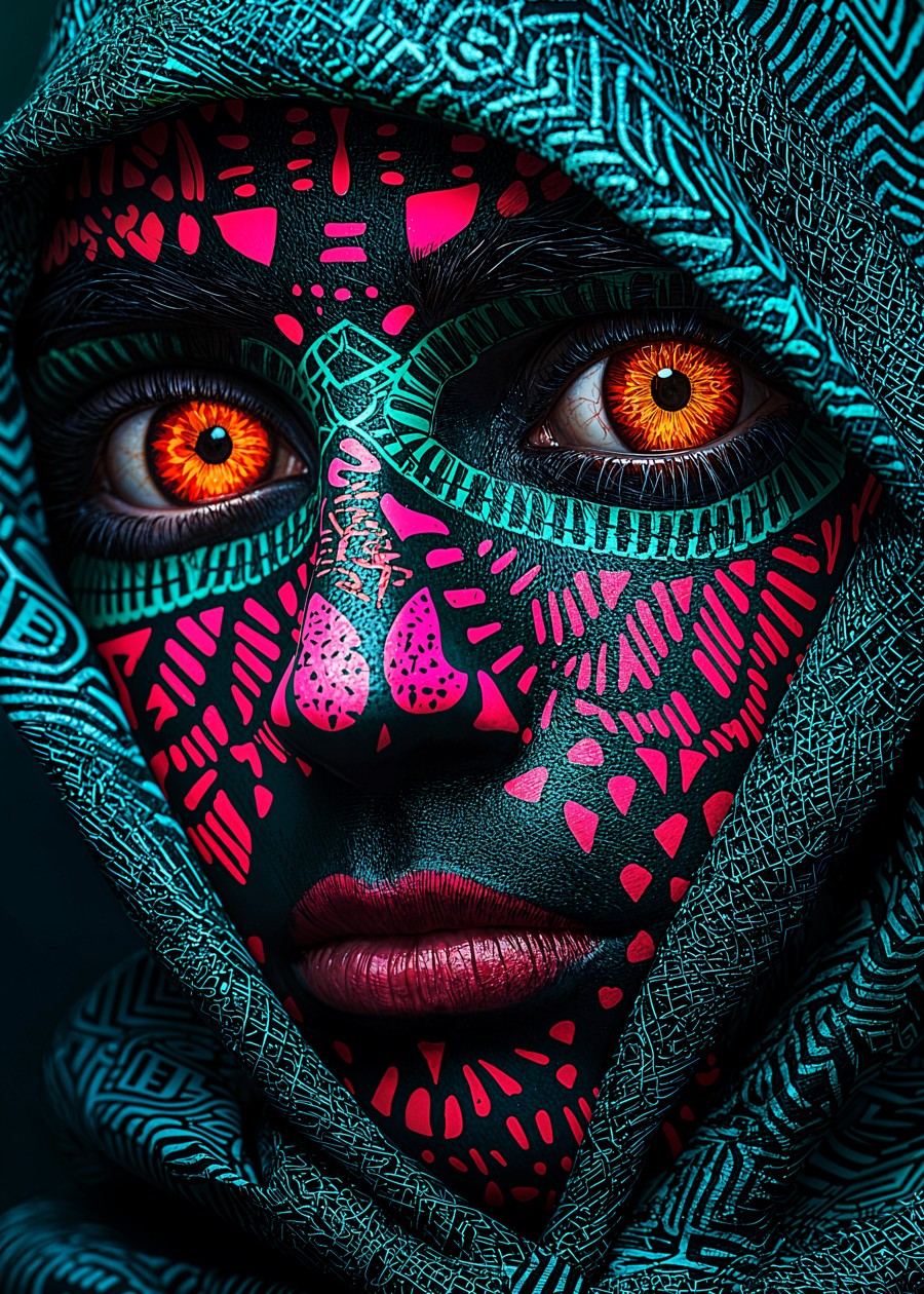 A glowing portrait of a mysterious figure with vivid tribal neon patterns and piercing fiery eyes wrapped in textured fabric