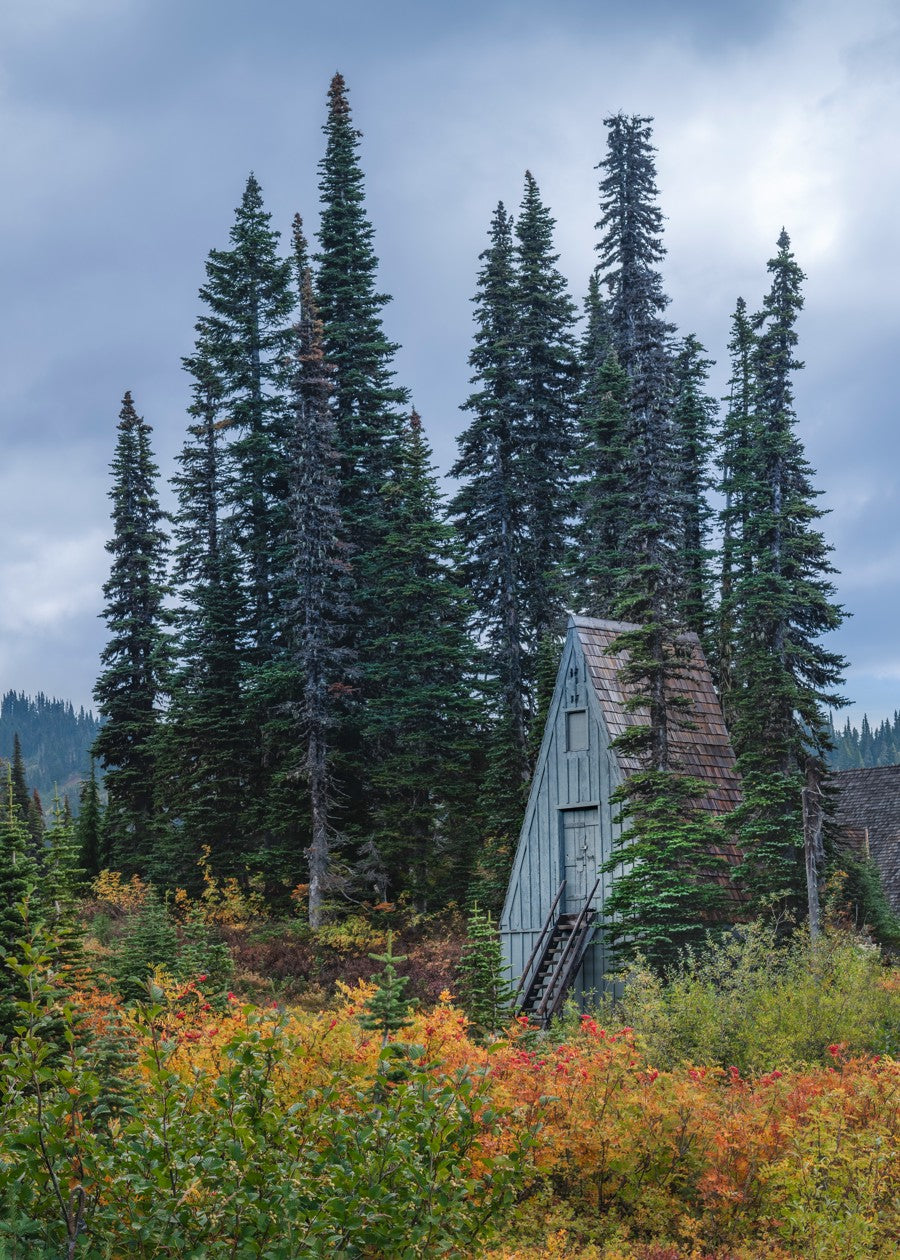 A quaint A-frame cabin nestled among tall pine trees against a cloudy sky. The surrounding autumn foliage showcases vibrant colors.