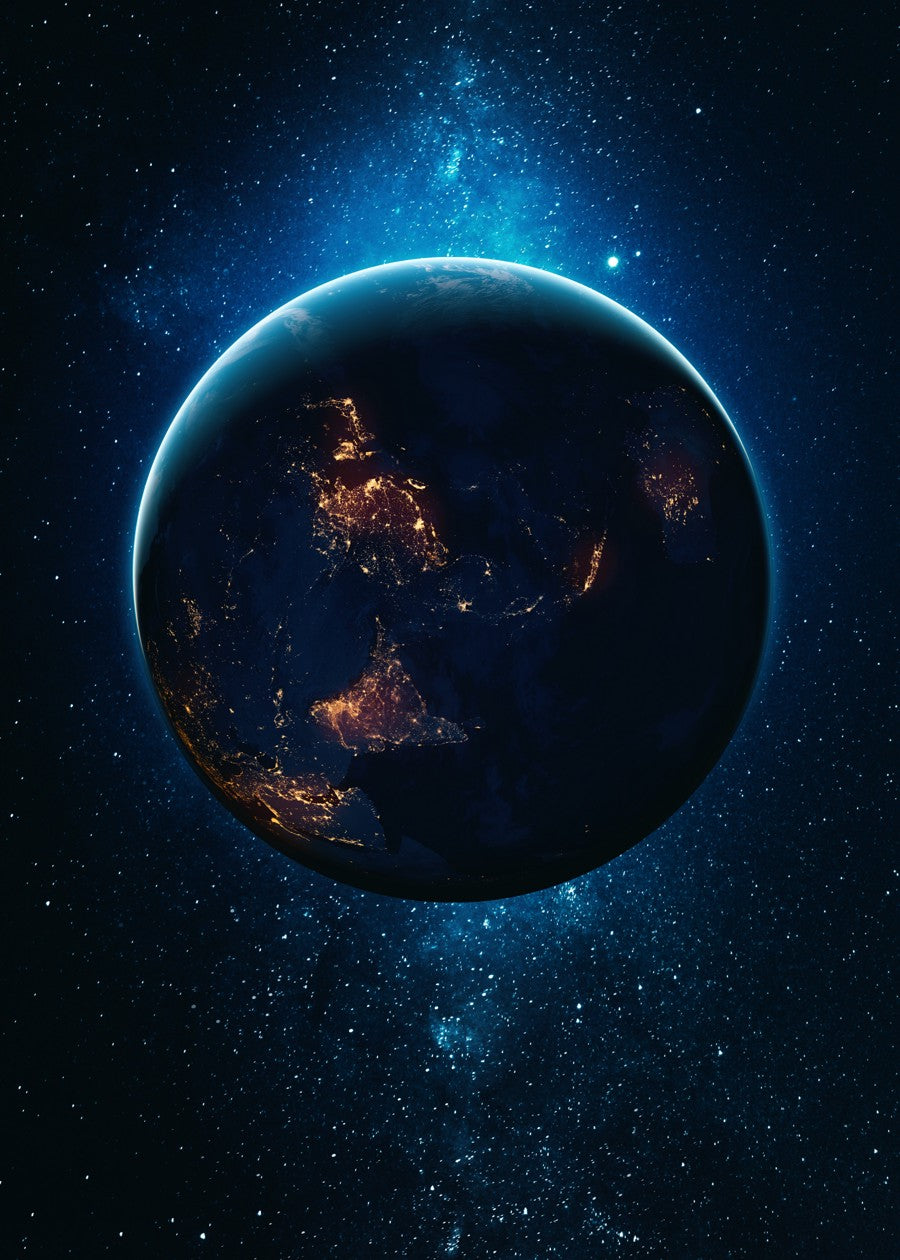 Earth at night, a shimmering orb of light, revealing the interconnected glow of human civilization against the starry void.