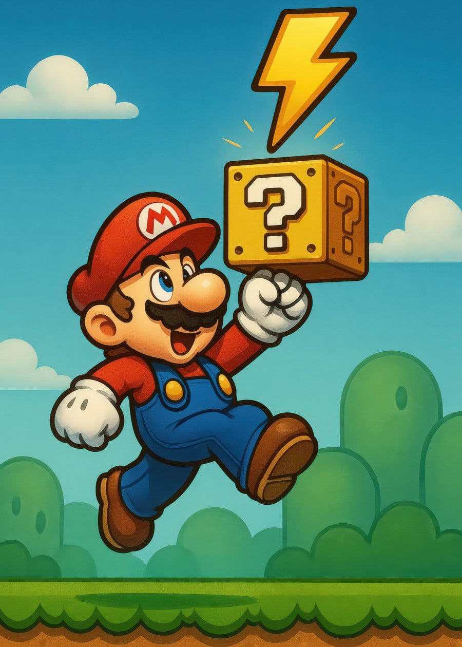 Mario jumps in excitement to hit a question mark block while a lightning bolt appears above him in a vibrant game world.