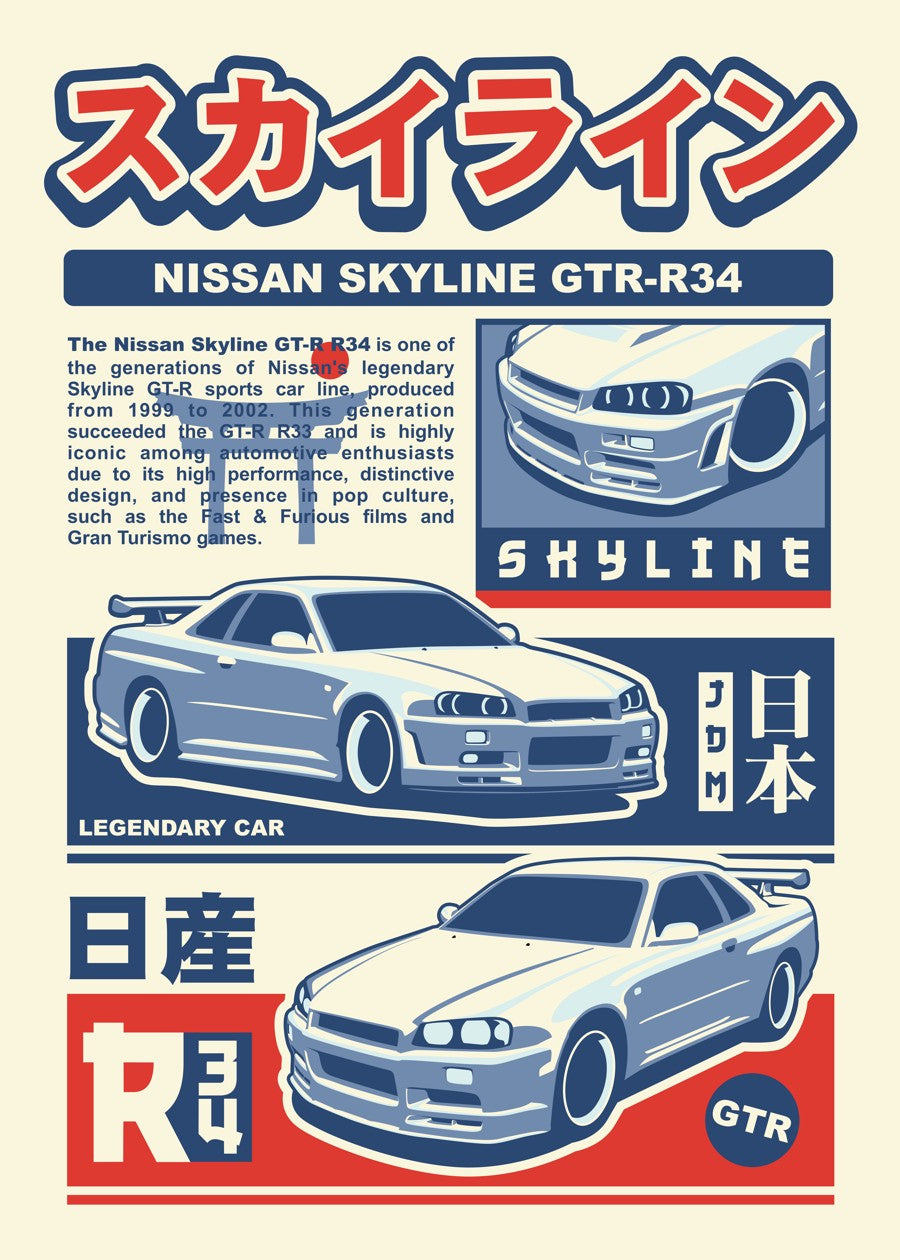 The Nissan Skyline GTR R34 is a legendary JDM icon with aggressive design and high performance that always captivates car enthusiasts.