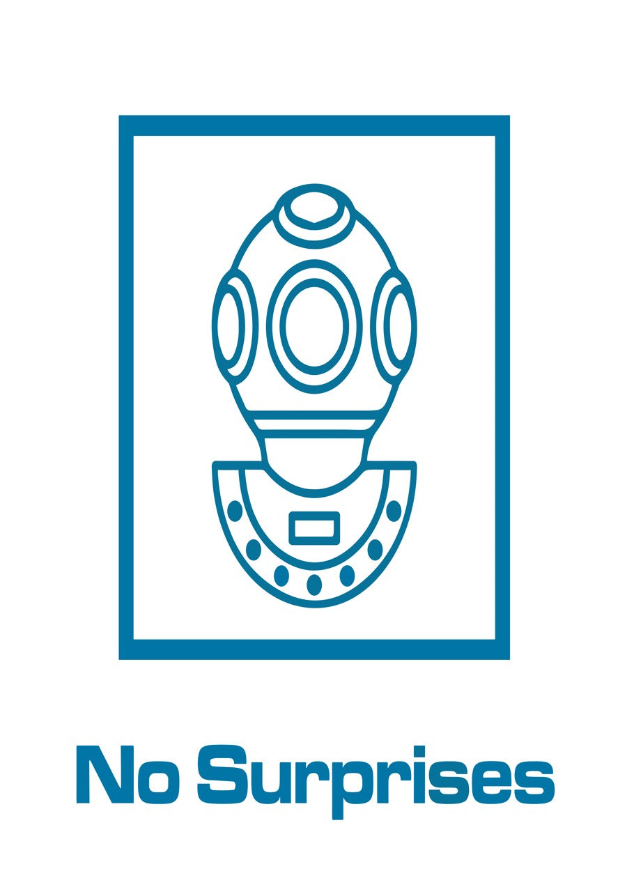 This clean blue icon draws a classic deep-sea diver’s helmet within a square, visually aligned with the phrase “No Surprises.”
