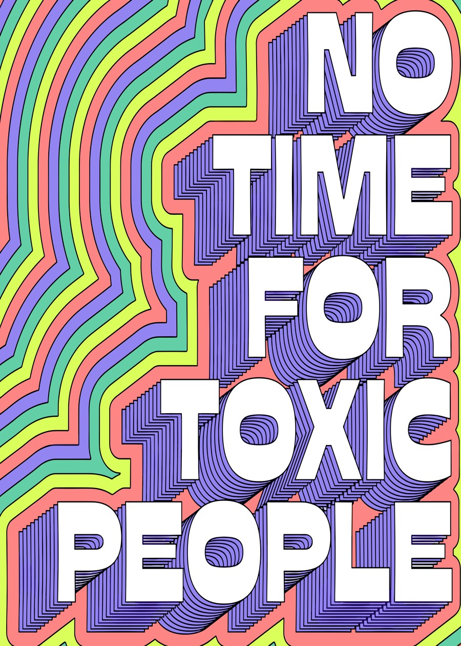 The statement “No Time For Toxic People” in white three-dimensional letters, set against an energetic backdrop.