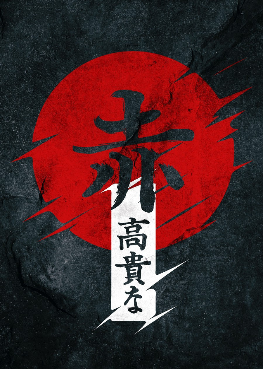 A powerful red sun disc, reminiscent of the Japanese flag, with the kanji for "red" (赤) and "noble" (高貴な) on a dark, textured stone background.