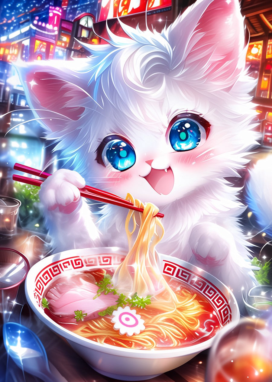Adorable white kitten enjoying a bowl of ramen under city lights.