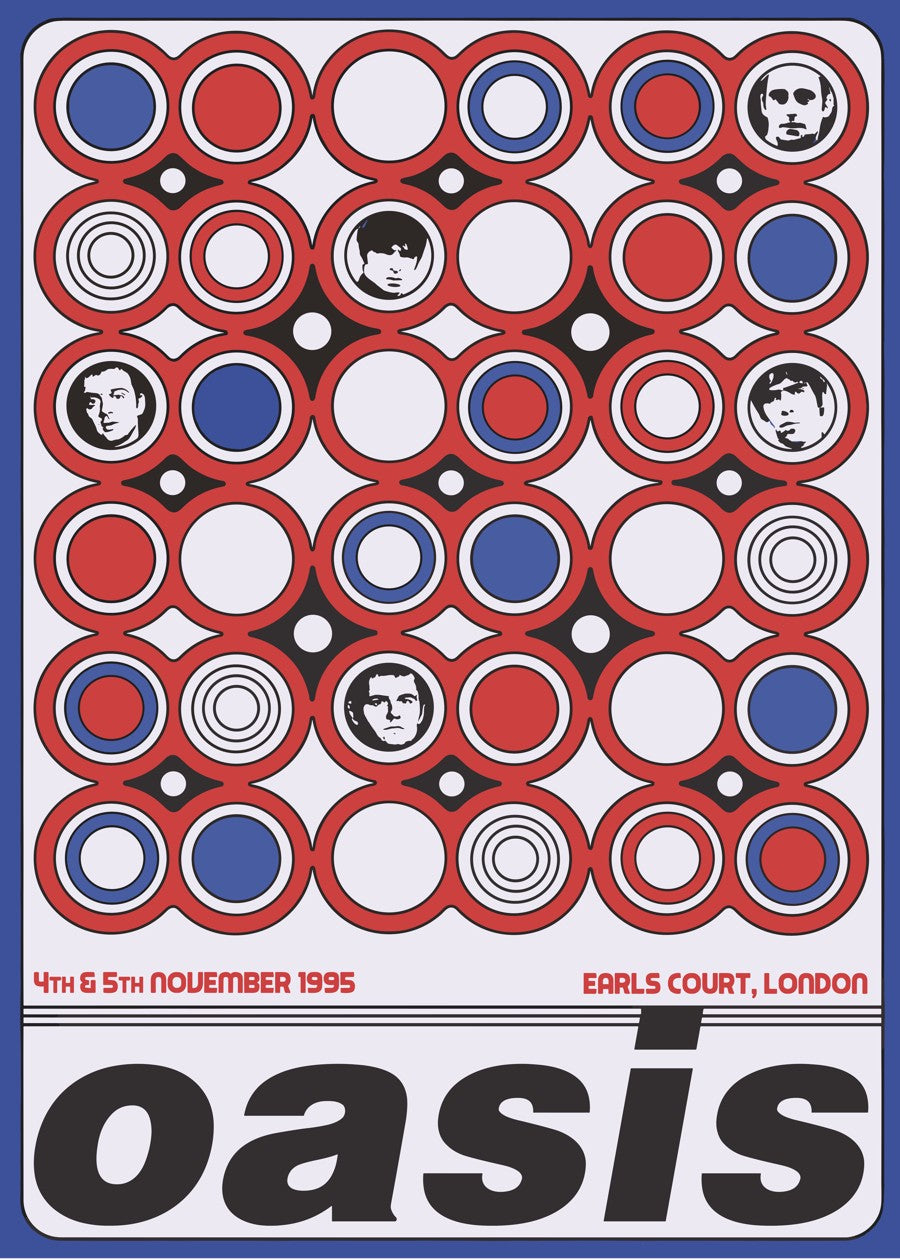 Oasis’s legendary London shows, featuring stylized portraits and bold red, blue, and black circles.