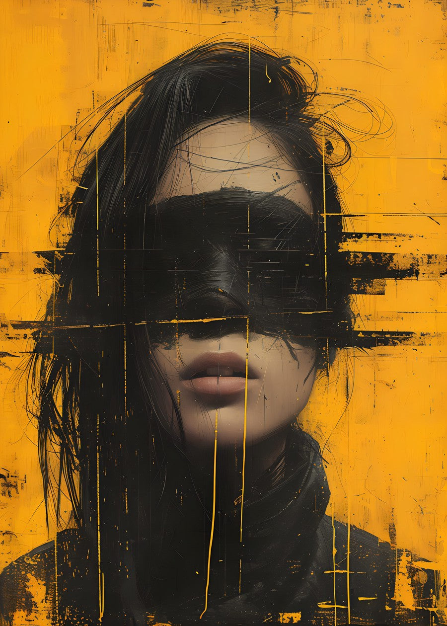 A haunting portrait of a masked woman wrapped in strokes of black and yellow.