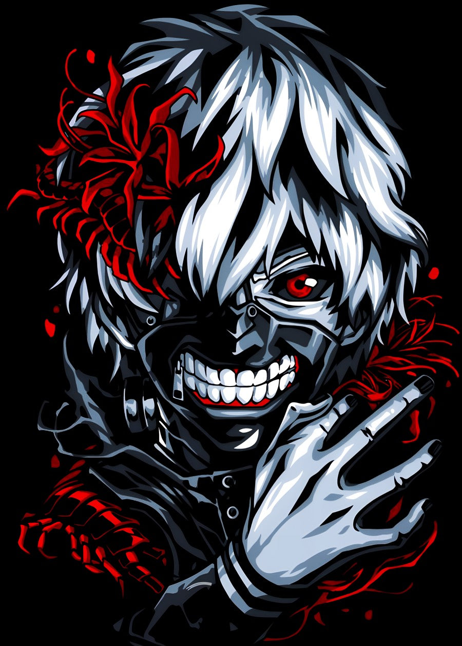 Ken Kaneki stands in darkness with white hair, red eye, and kagune flaring—his mask and power embodying the terror of Tokyo Ghoul.