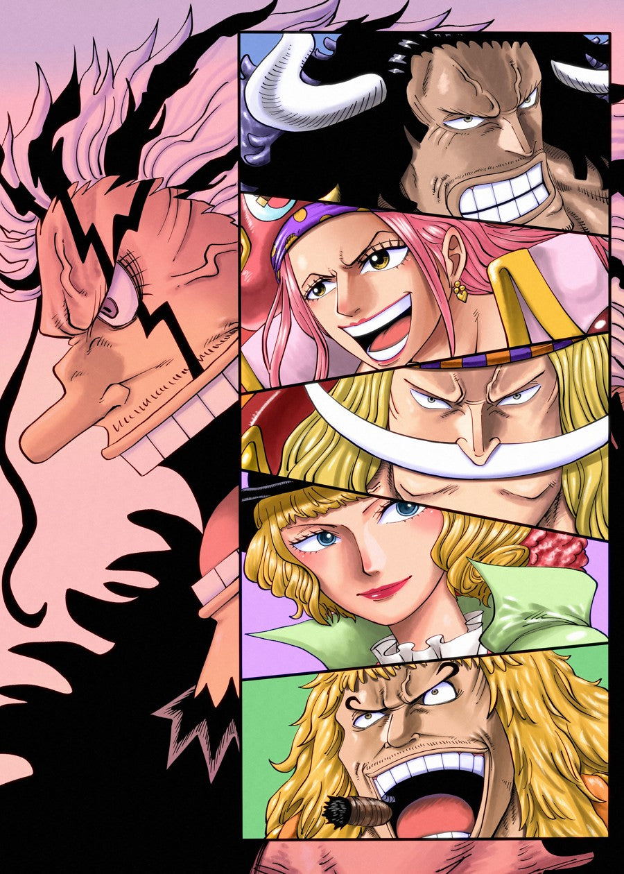 Kaido, Charlotte Linlin (Big Mom), Edward Newgate (Whitebeard), Charlotte Pudding and Donquixote Doflamingo from One Piece