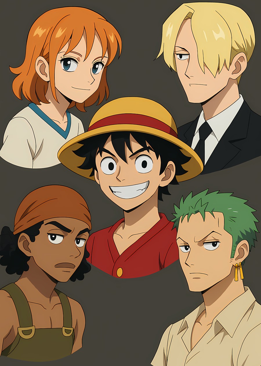 Stylized portrait of the Straw Hat Crew featuring Luffy, Zoro, Sanji, Nami, and Usopp. Classic anime art style.
