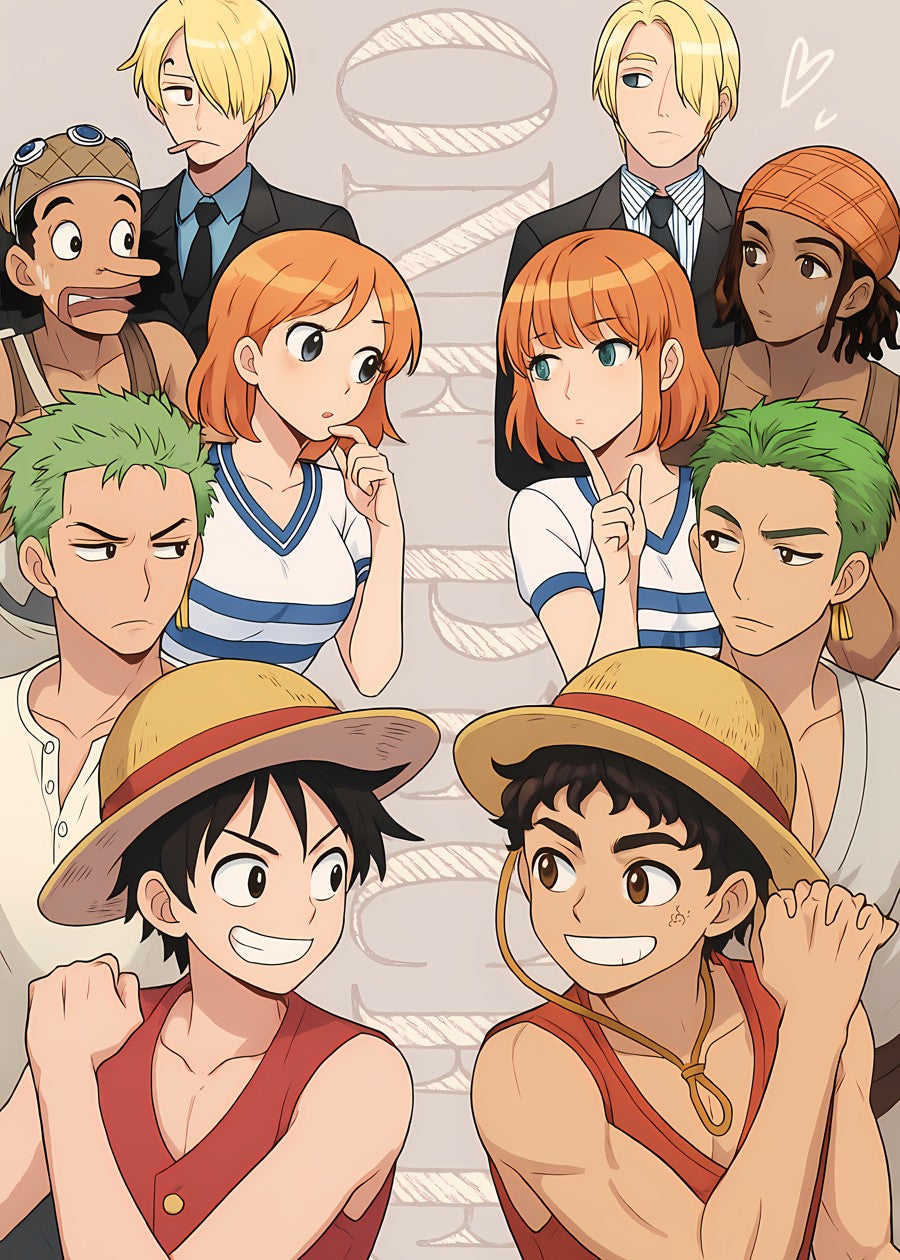 The Straw Hat Crew facing their mirror versions in a fun and stylish anime crossover design.