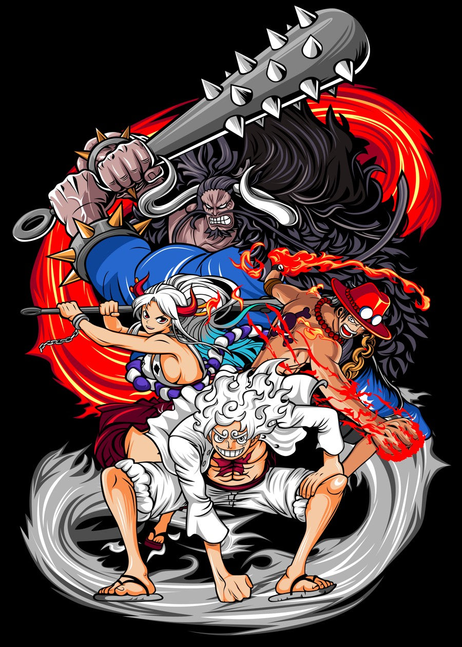 Gear 5 Luffy leads a fierce team into battle against Kaido in this fiery One Piece scene.