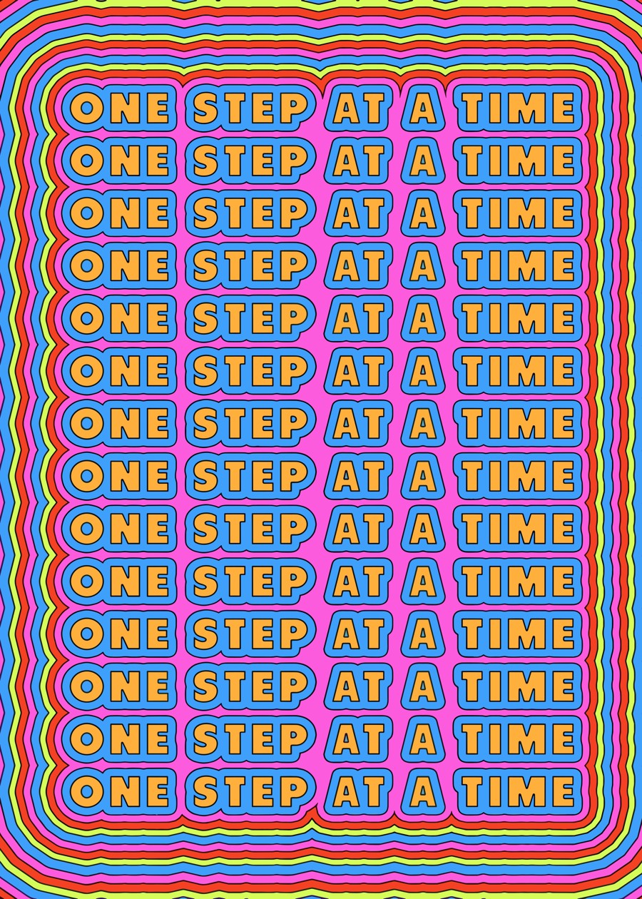 Energetic psychedelic art with the phrase “One Step At A Time” repeated in rows, featuring orange and blue text against a vibrant, wavy pink.