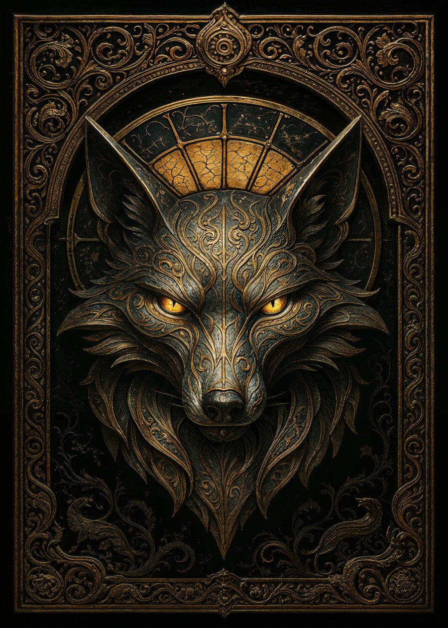 A graceful fox with glowing eyes emerges from gold and metal, framed in gothic symmetry. This elegant dark fantasy artwork blends stealth.