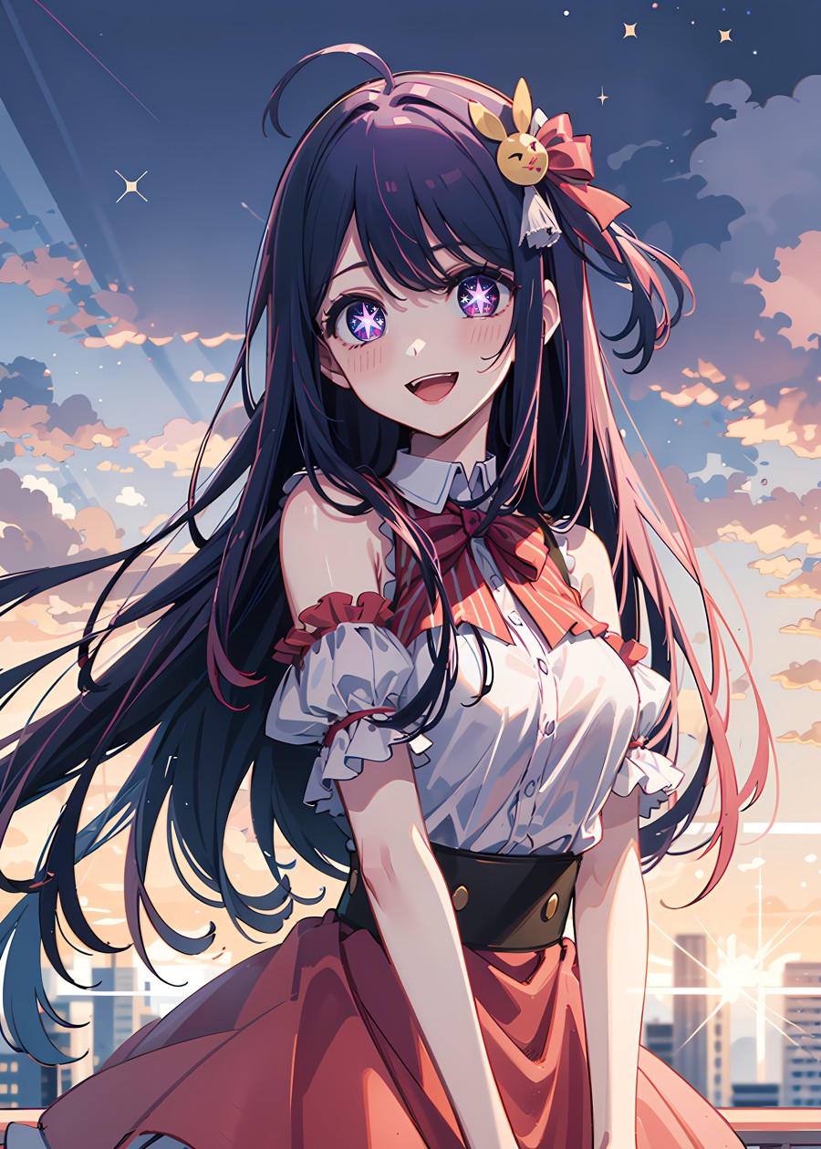 A cheerful idol with sparkling eyes shines against a sunset cityscape, blending charm, dreams, and a touch of magic.