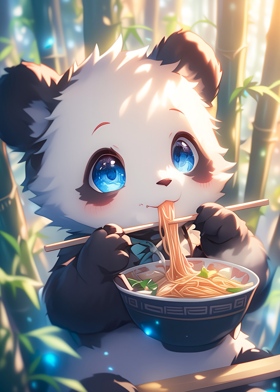 A cute panda in a bamboo forest enjoying a bowl of noodles.