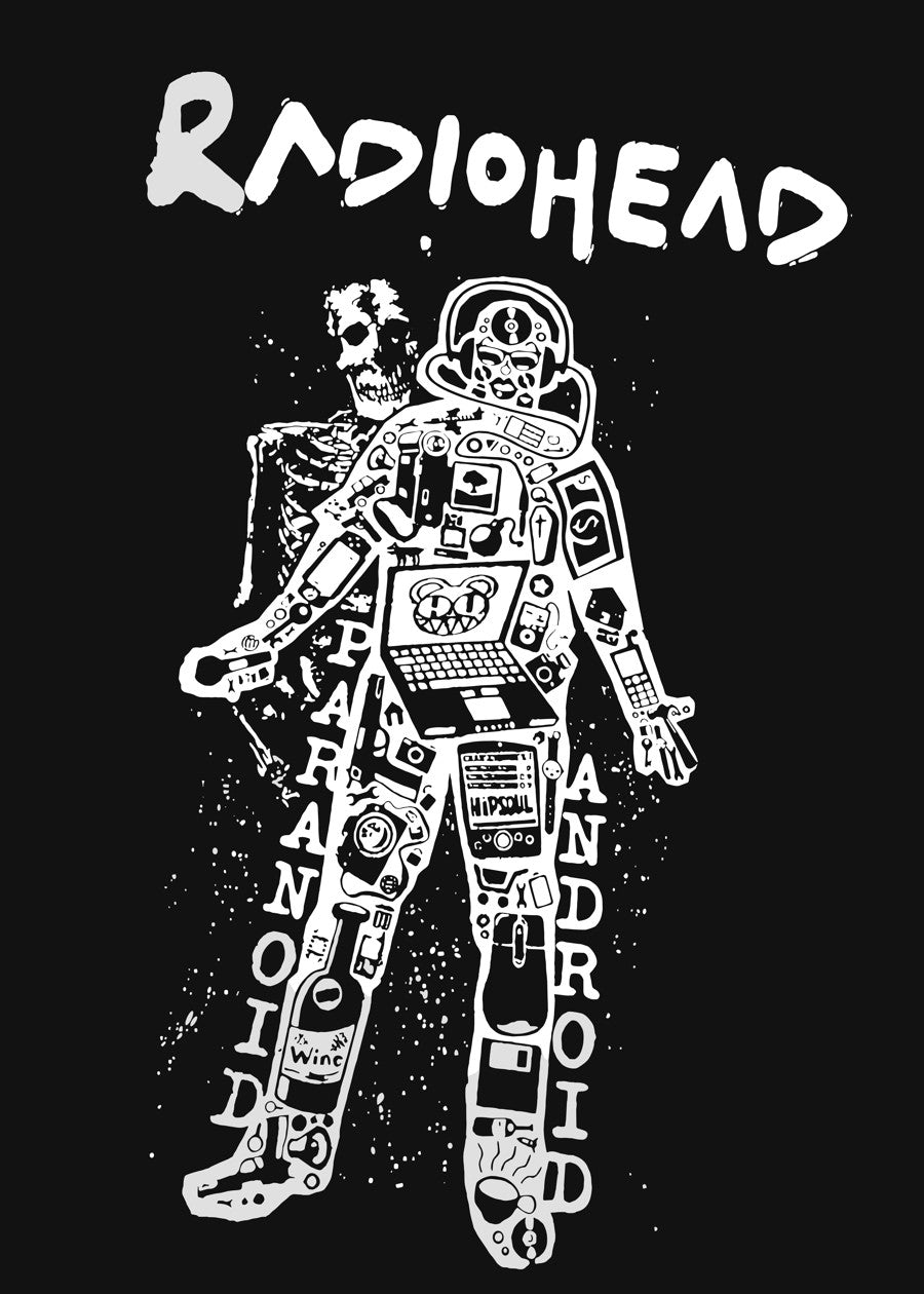 A striking monochrome illustration featuring a robot-like android composed of various devices and symbols.