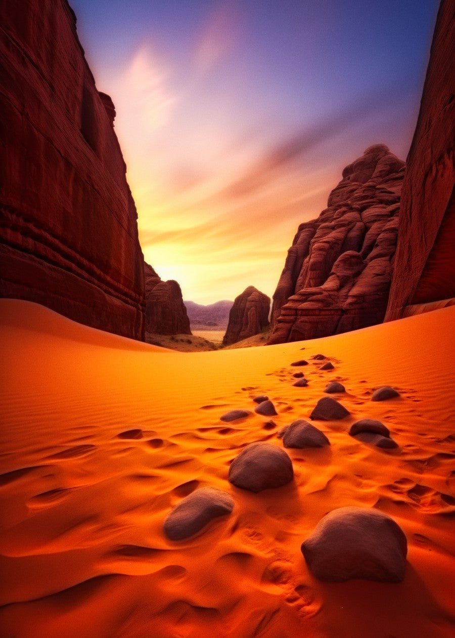 A winding path opens between towering red rock walls, glowing under the warm hues of sunset.