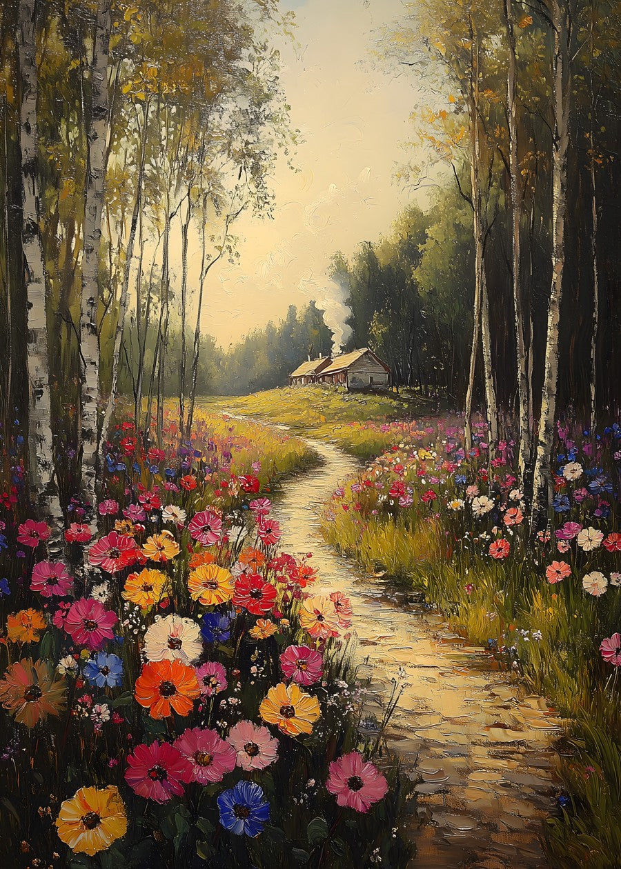 A vibrant wildflower path leads to a cozy cabin in a sunlit forest.