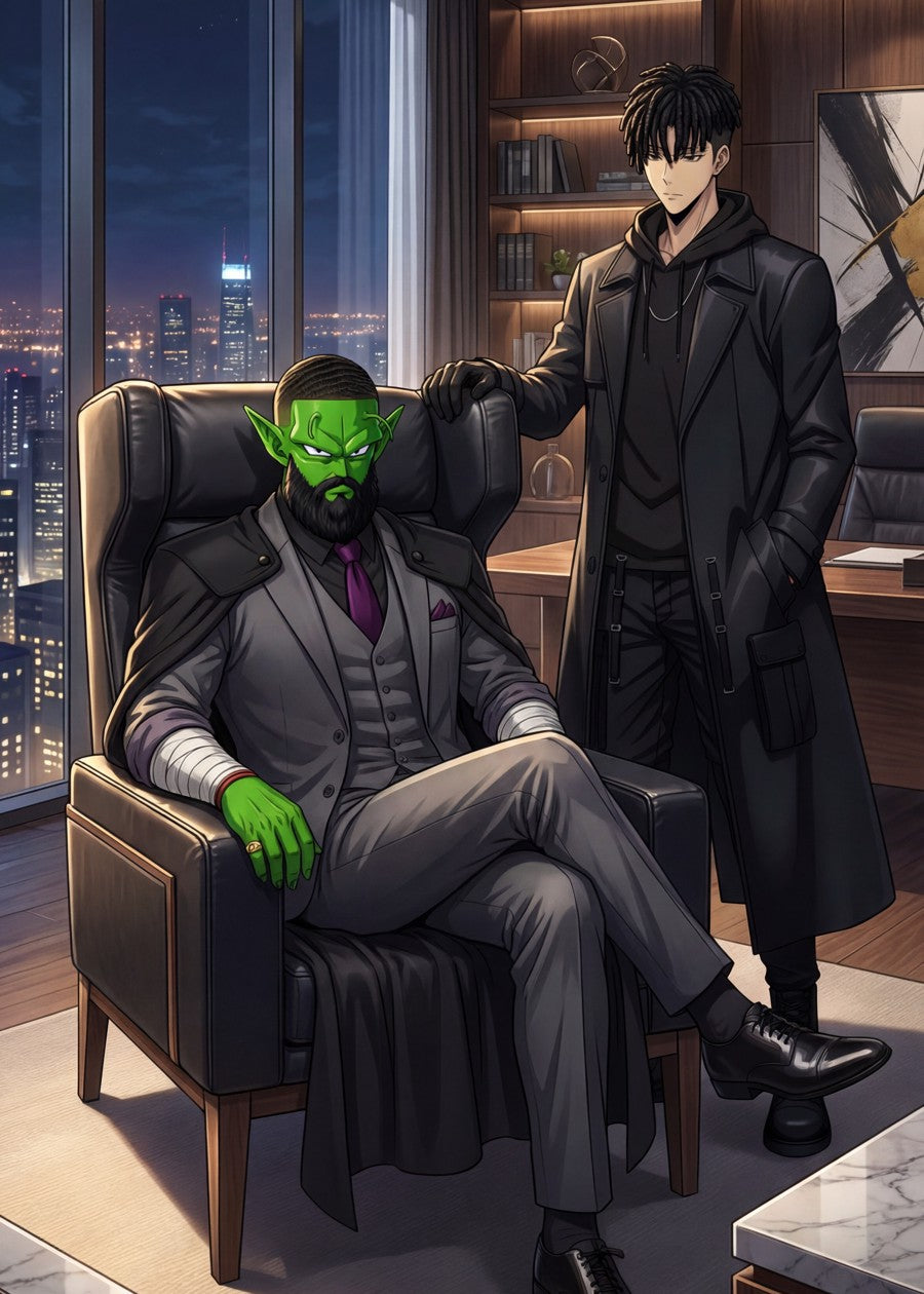 An unexpected crossover! Dragon Ball's Piccolo and Solo Leveling's Sung Jinwoo reimagined as luxury mafia bosses.