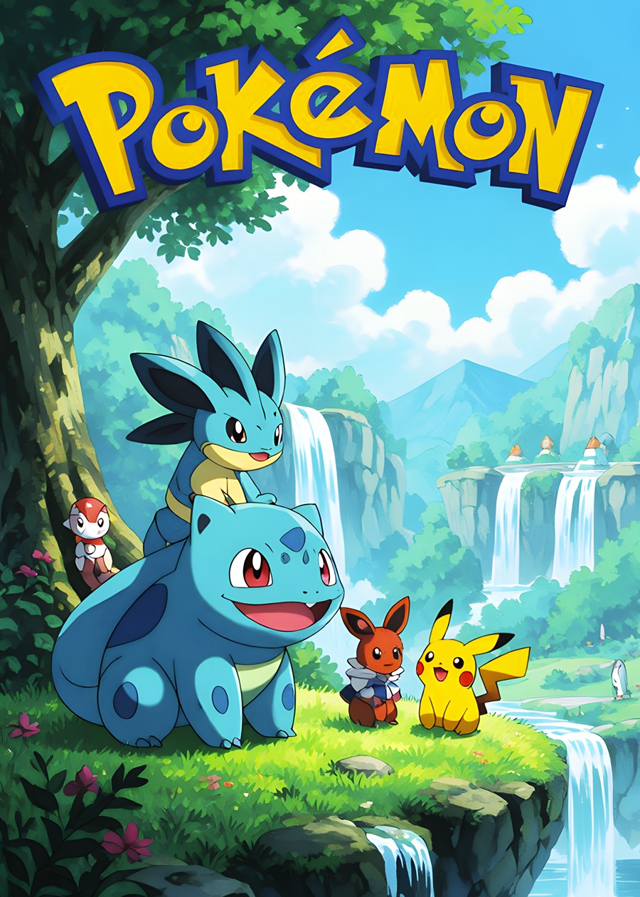 Bulbasaur, Totodile, Eevee, Pikachu, and Oddish gather in a bright meadow of mountains, blue skies, and waterfalls flowing below.