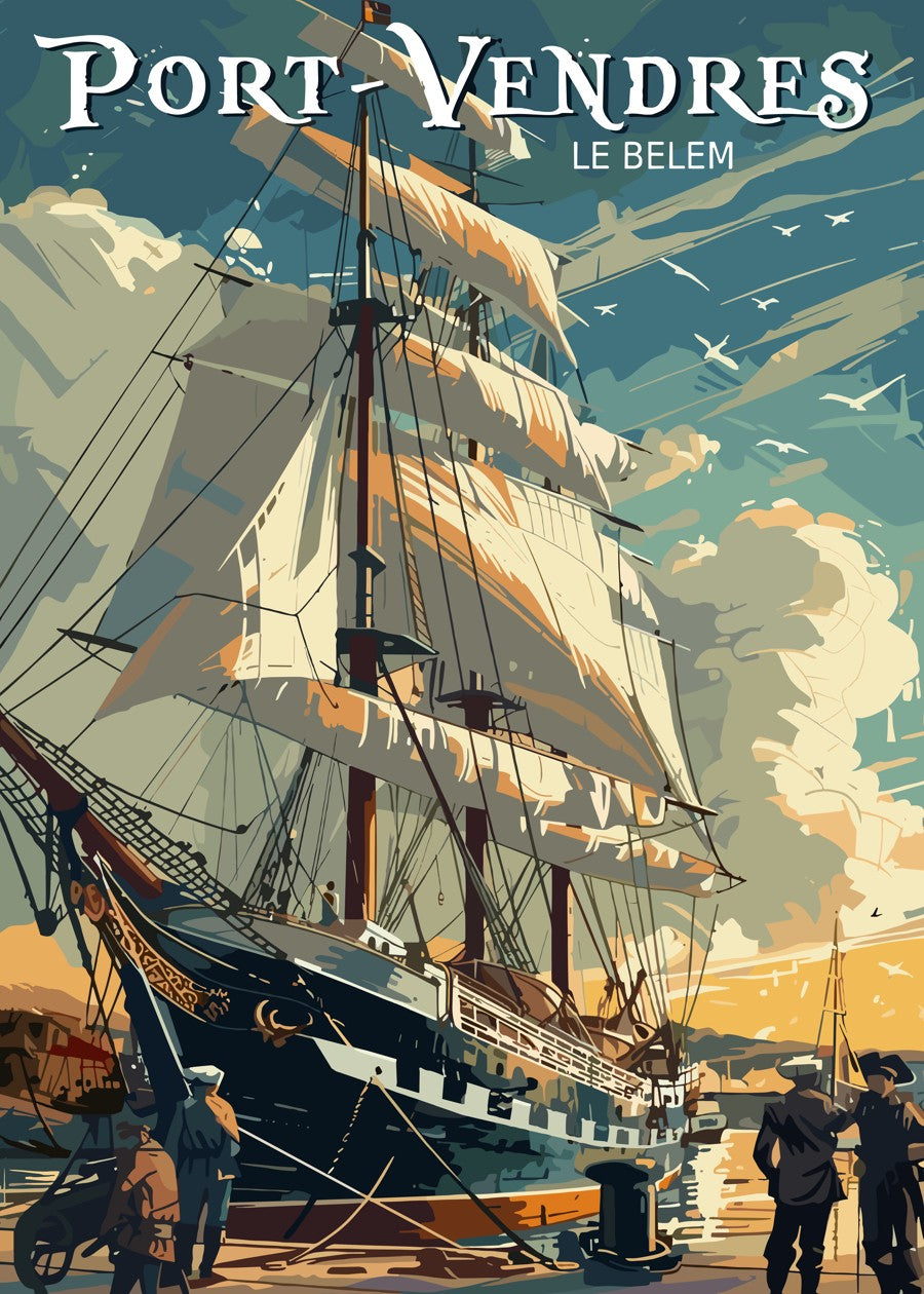 This striking vintage-style illustration captures the majestic sailing ship Belem docked at Port-Vendres under dramatic skies. The artwork f
