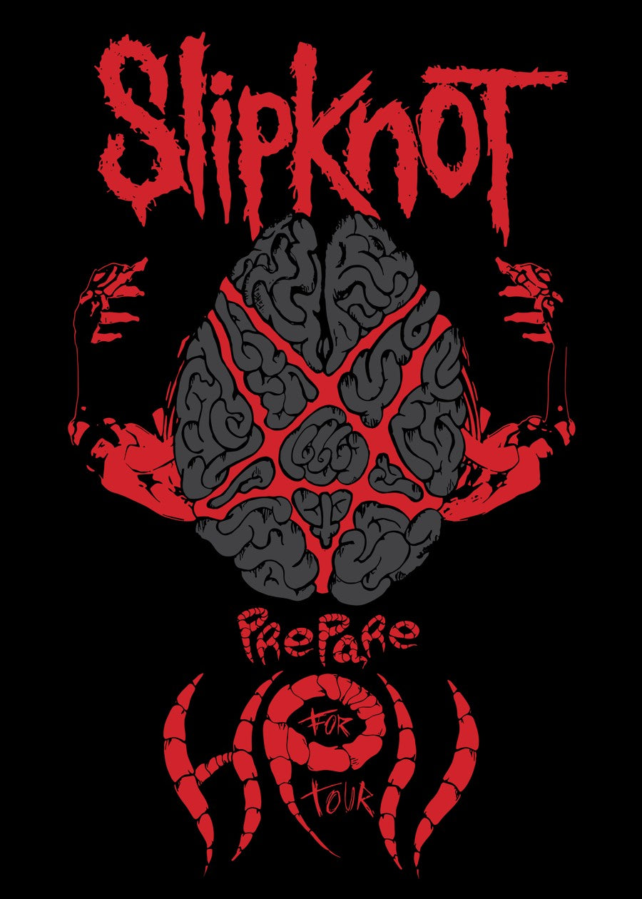 A gritty poster design for Slipknot's "Prepare for Hell Tour," featuring the band's name in bold, blood-red letters above a stylized brain,