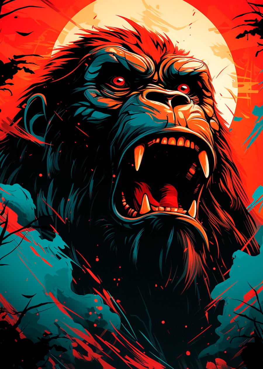 A fierce, dark gorilla roars against a brilliant red and orange backdrop. Vicious teeth and glowing red eyes in a powerful, vibrant, graphic.